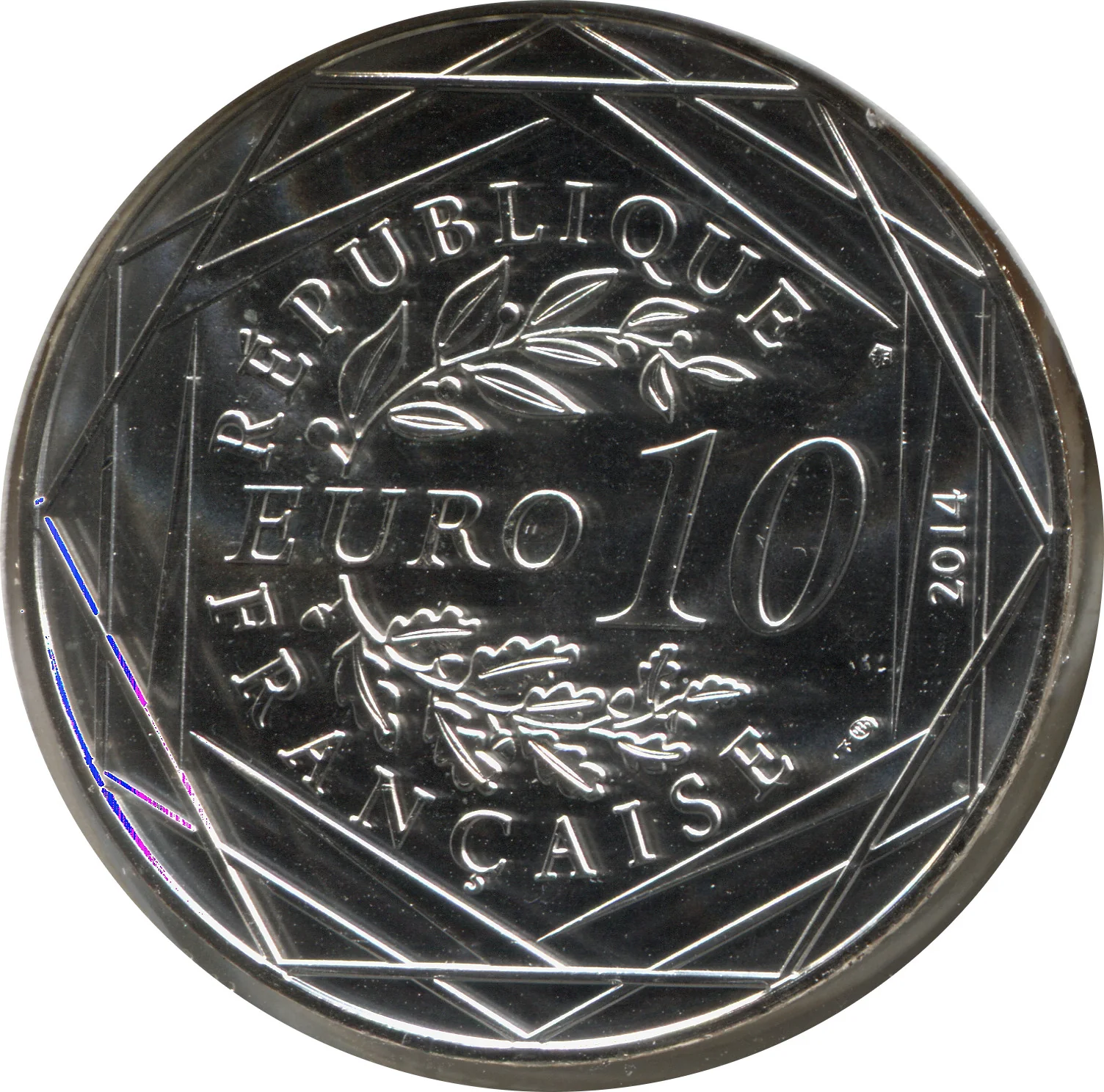 "10 EURO" flanked by laurel and oak branches, encircled by "RÉPUBLIQUE FRANÇAISE," three hexagons, and the issue year.