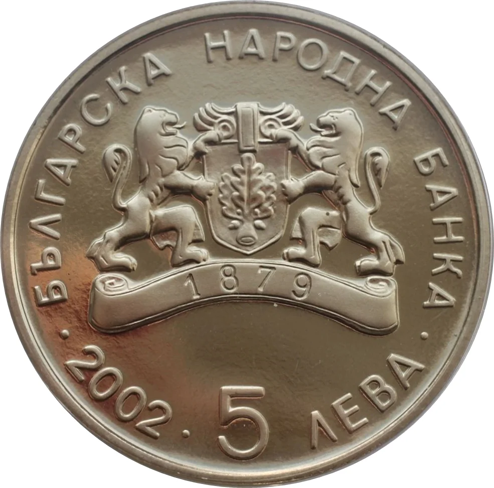 The obverse features the BNB logo, the numeral "5", the text "ЛЕВА" and "БЪЛГАРСКА НАРОДНА БАНКА", and the issue year "2002".
