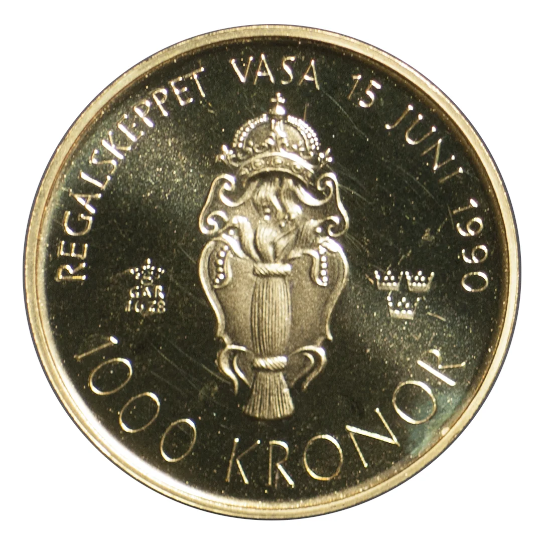 Shield with Vasa coat of arms under a royal crown. Left: crown with "GAR" monogram and year 1628. Right: Sweden's Three Crowns. Value below.