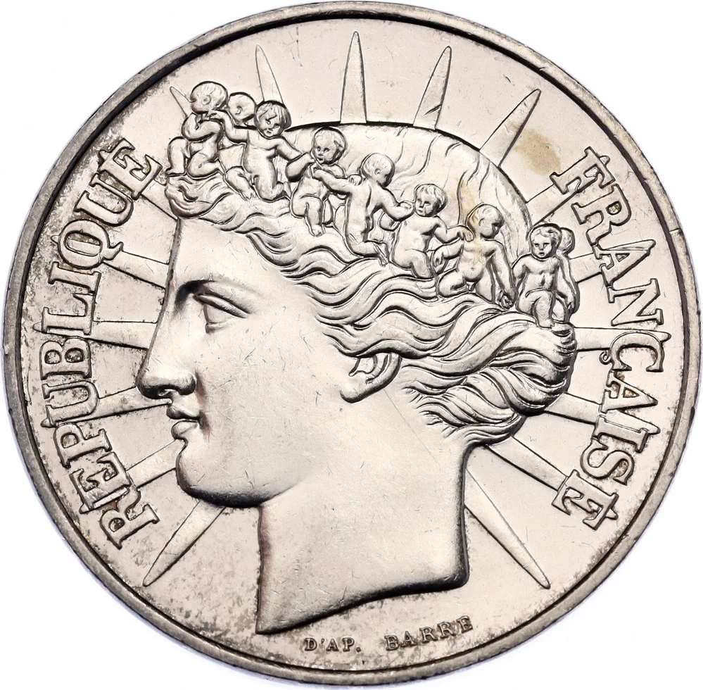 Left-facing allegorical Republic crowned with children, encircled by "REPUBLIQUE FRANÇAISE".
