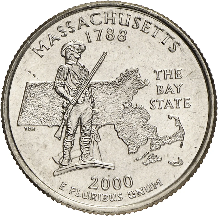 "The Minuteman" statue and state outline with "MASSACHUSETTS," "1788," "THE BAY STATE," and "E PLURIBUS UNUM."