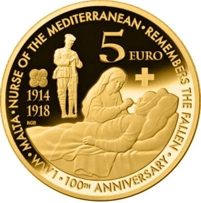 The reverse depicts a nurse treating a wounded soldier, recalling Malta's humanitarian role in WWI with its hospitals and convalescent camps. It also features a soldier and a remembrance poppy. Designed and engraved by Noel Galea Bason.