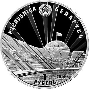 Description: Featuring the relief image of the State Coat of Arms of Belarus at the top, the new building of the Belorussian State WWII History Museum in Minsk at the center, and circumferential inscriptions: "РЭСПУБЛIКА БЕЛАРУСЬ" above and "1 РУБЕЛЬ" with the year of issue below.