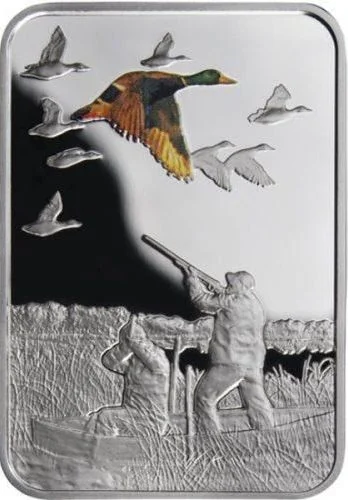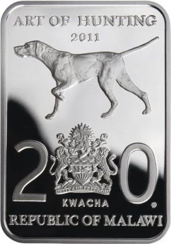 Description: Top: "The Art of Hunting" inscription. Center: a pointer dog in hunting stance. Bottom: face value "20 kwacha" with mint mark "MW" between digits, above Malawi's national emblem. Issuer: "Republic of Malawi."