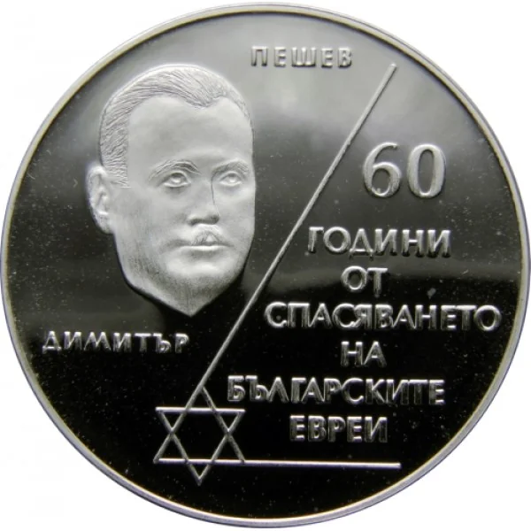 Description: The reverse features Dimitar Peshev's image, the inscriptions "ДИМИТЪР ПЕШЕВ" and "60 ГОДИНИ ОТ СПАСЯВАНЕТО НА БЪЛГАРСКИТЕ ЕВРЕИ," and the Star of David.
