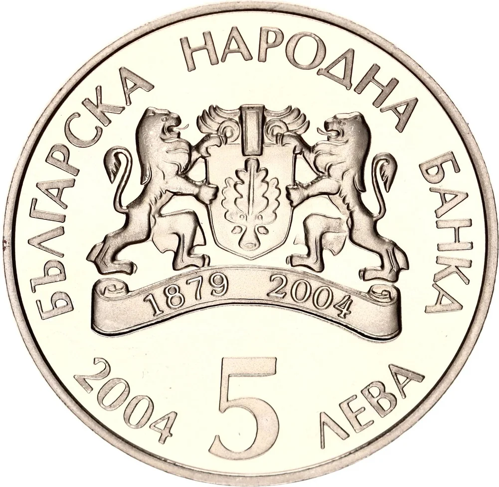The obverse displays the Bulgarian National Bank logo with '1879' and '2004' on its ribbon. Around the edge are the denomination '5 ЛЕВА', the issue year '2004', and 'БЪЛГАРСКА НАРОДНА БАНКА'.