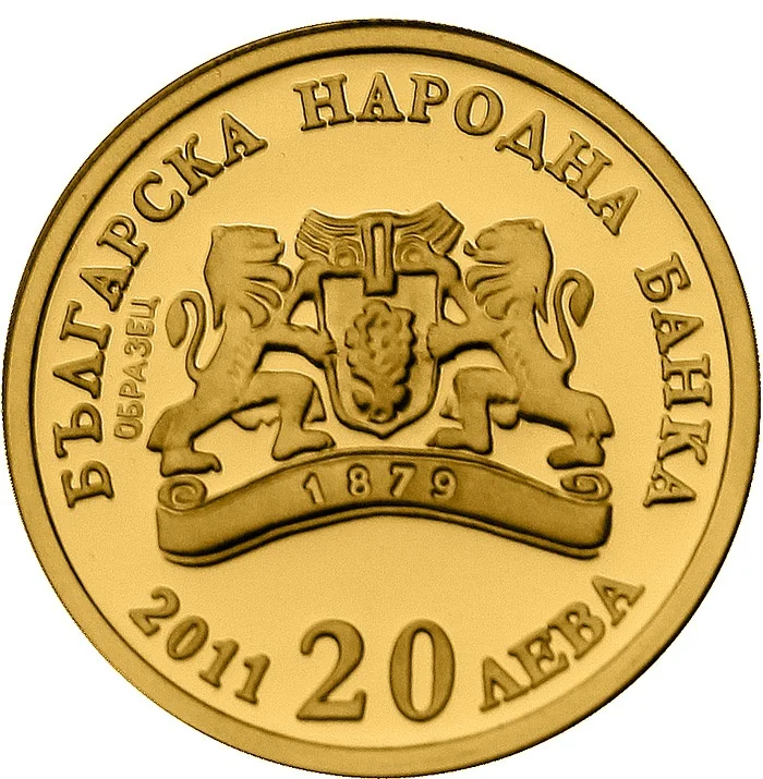 Description: The obverse shows the Bulgarian National Bank logo with "1879" on its ribbon, surrounded by "БЪЛГАРСКА НАРОДНА БАНКА," "20 ЛЕВА," and the issue year.