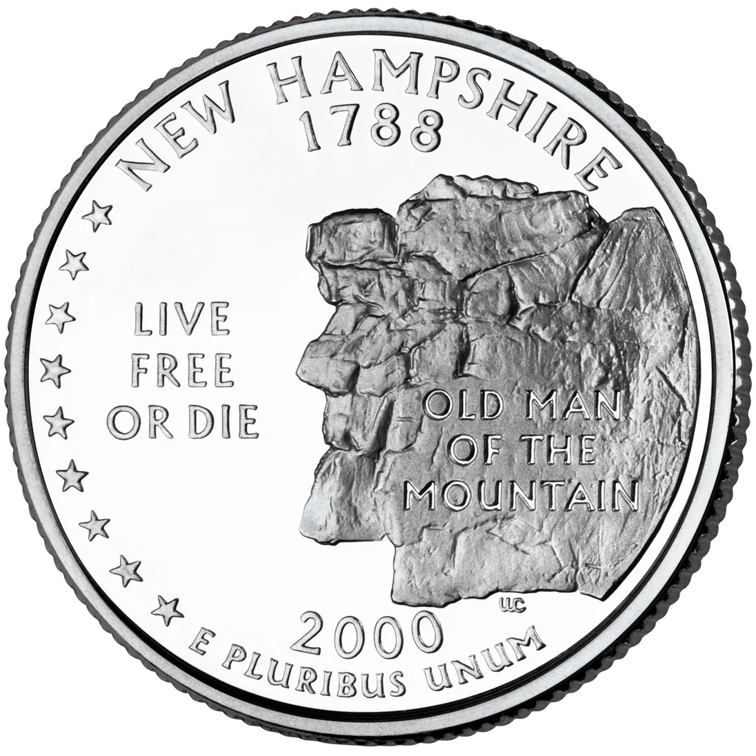 The Old Man of the Mountain, a collapsed rock formation, is depicted with the legend "OLD MAN OF THE MOUNTAIN," the state name, admission date "1788," the motto "LIVE FREE OR DIE," nine stars for its ratification order, and "E PLURIBUS UNUM."