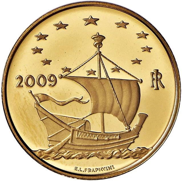 Europe depicted as a ship sailing under the EU's twelve stars. Left: issue year. Right: "RI" monogram. Bottom center: author's name.