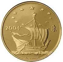 Europe depicted as a ship sailing under the EU's twelve stars. Left: issue year. Right: "RI" monogram. Bottom center: author's name.