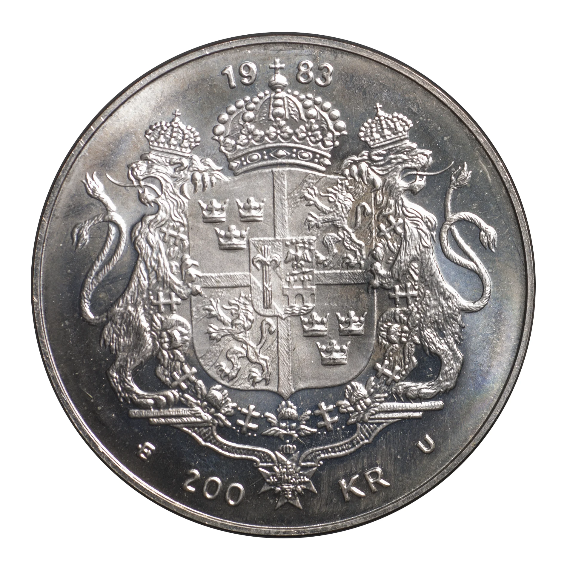 Crowned coat of arms with lion supporters and an Order Chain. The date is above, the value below. Flanking letters: E for Eskilstuna mint; U for the Riksbank Governor's surname initial.