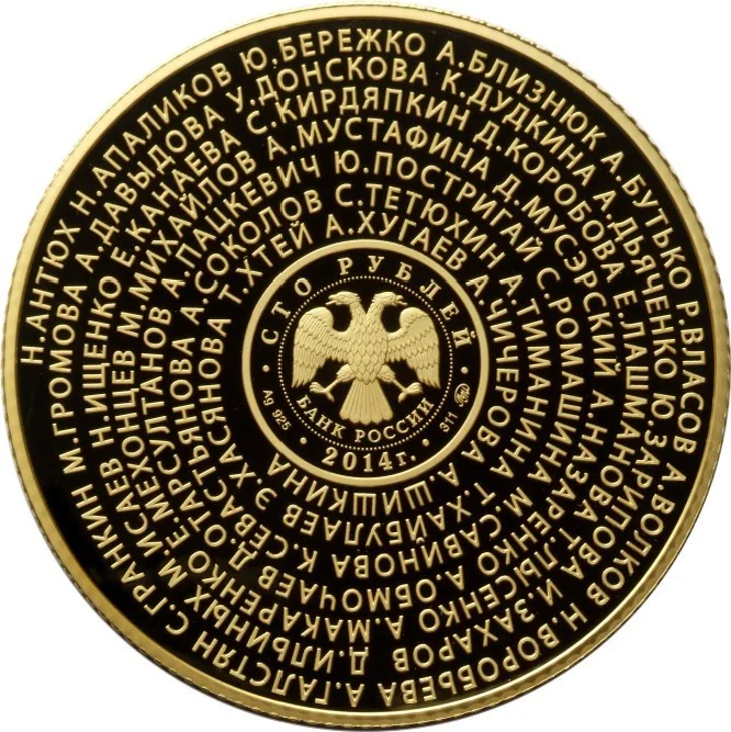 At the coin's center, within a dotted circle, is the Bank of Russia emblem (a two-headed eagle with the inscription "БАНК РОССИИ"). The rim reads "СТО РУБЛЕЙ" above, with metal details and "2014 г." below. The mirrored field around the emblem spirals with the names of 47 Russian champions from the London Olympics.