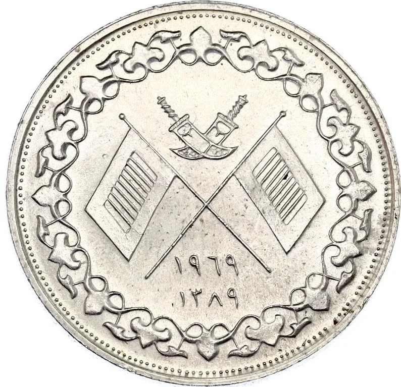State emblem: crossed khanjar daggers between two flags on crossed poles, with dates, enclosed in a wreath.
