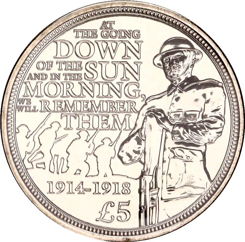 Soldier standing right, four soldiers left, legend above, denomination below.
