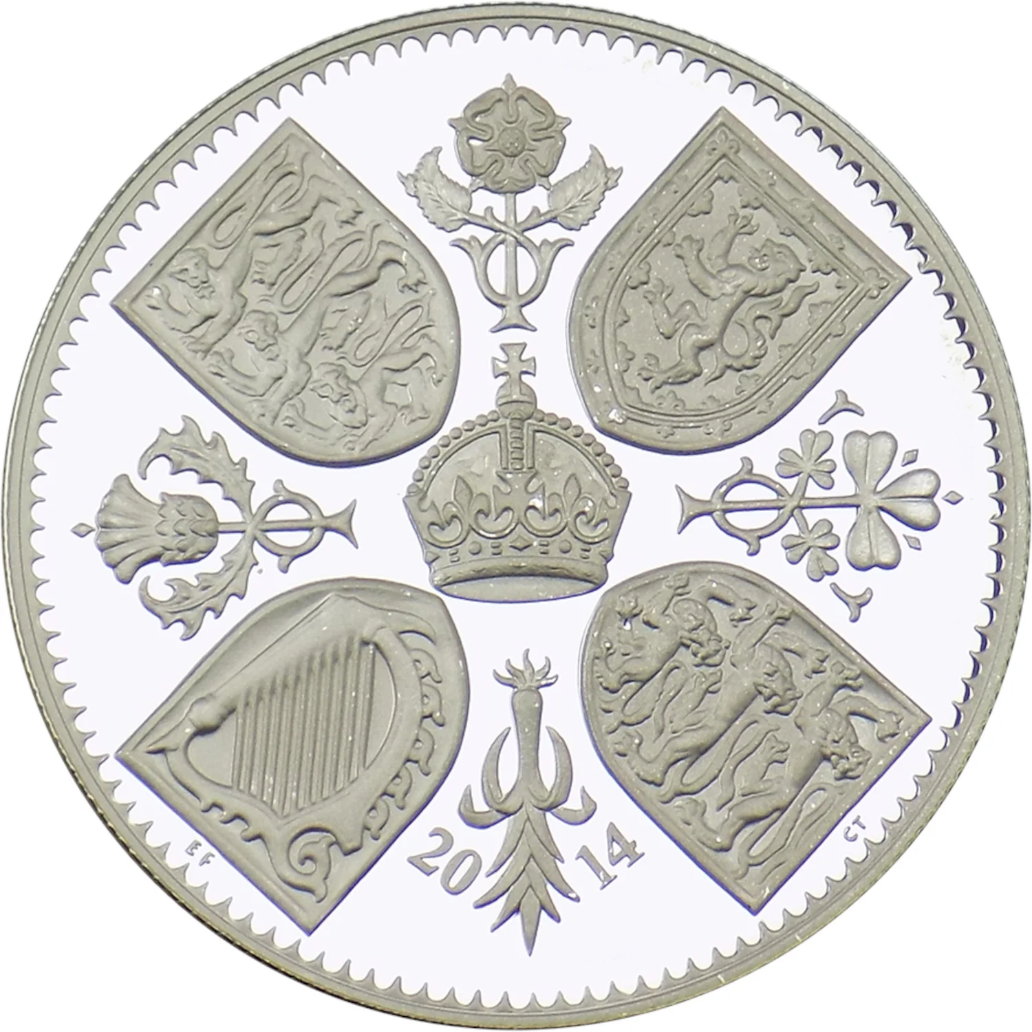 The Royal Arms' four quarterings on shields in saltire, with a rose, thistle, shamrock, and leek between them; the Crown in the centre and the date below.