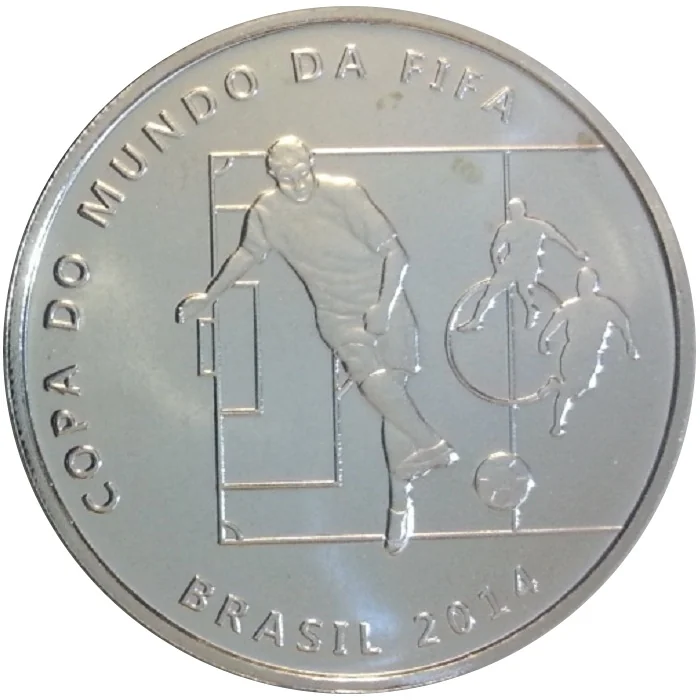 Soccer ball pattern background, Brazil map foreground. Top left: value. Bottom right: trophy cup.