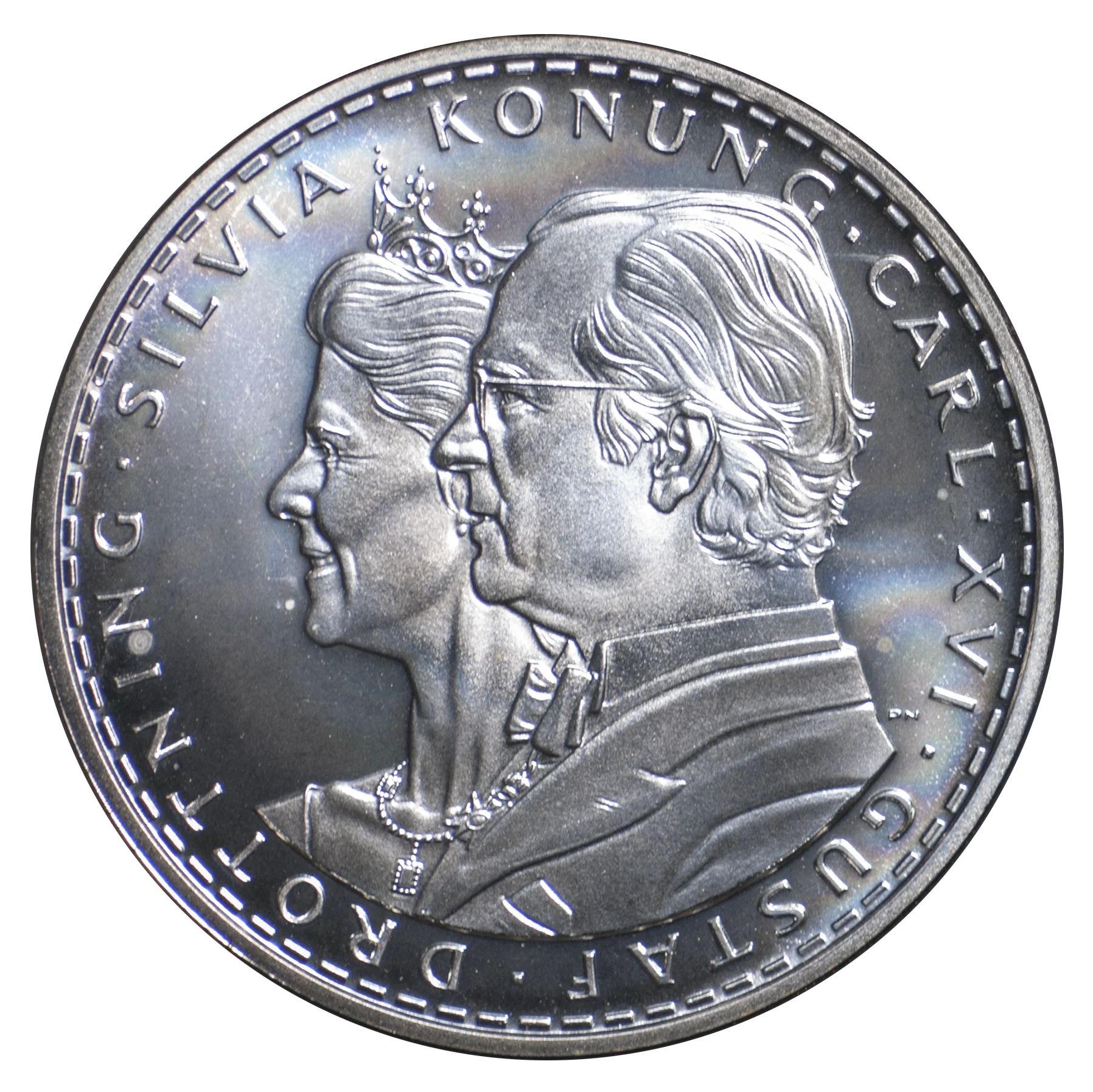 Conjoined busts of Carl XVI Gustaf and Queen Silvia facing left, with the artist's initials PN to the right, within an outer ring of small squares.