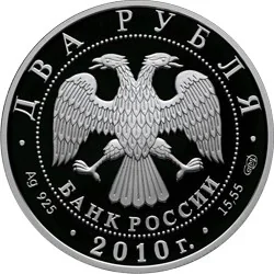 Center: Bank of Russia emblem (two-headed eagle, wings down, with "БАНК РОССИИ" below), within a dotted circle. Rim inscriptions: top - "ДВА РУБЛЯ"; bottom left - metal and fineness; center - "2010 г."; bottom right - metal content and mint mark.
