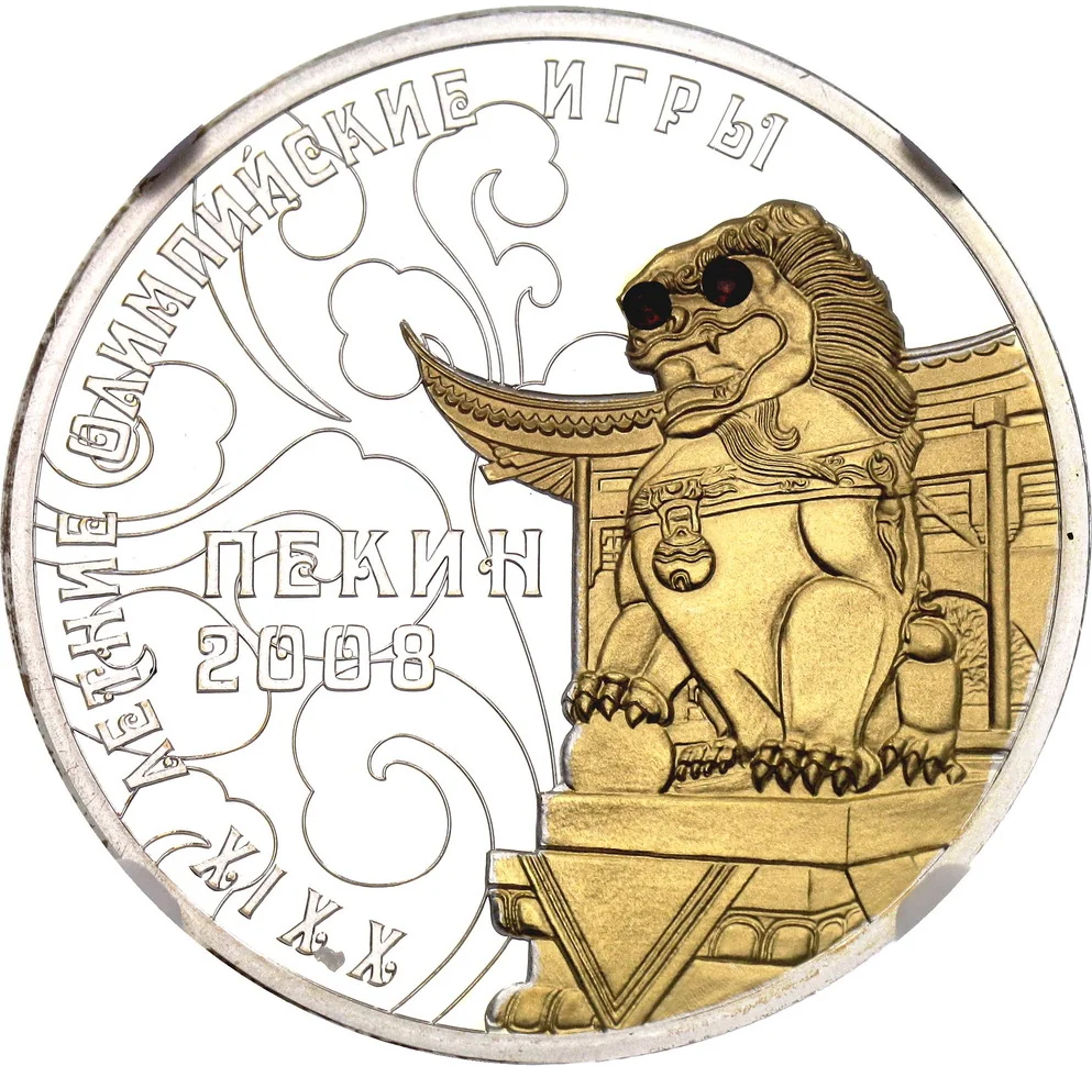 Description: Silver (.925), gilt with two garnets. The left side features "10 РУБЛЕЙ" above the Pridnestrovian Moldavian Republic State Emblem. The right side depicts a runner with a red Olympic flame, encircled by «ПРИДНЕСТРОВСКИЙ РЕСПУБЛИКАНСКИЙ БАНК» and the year "2008" below.