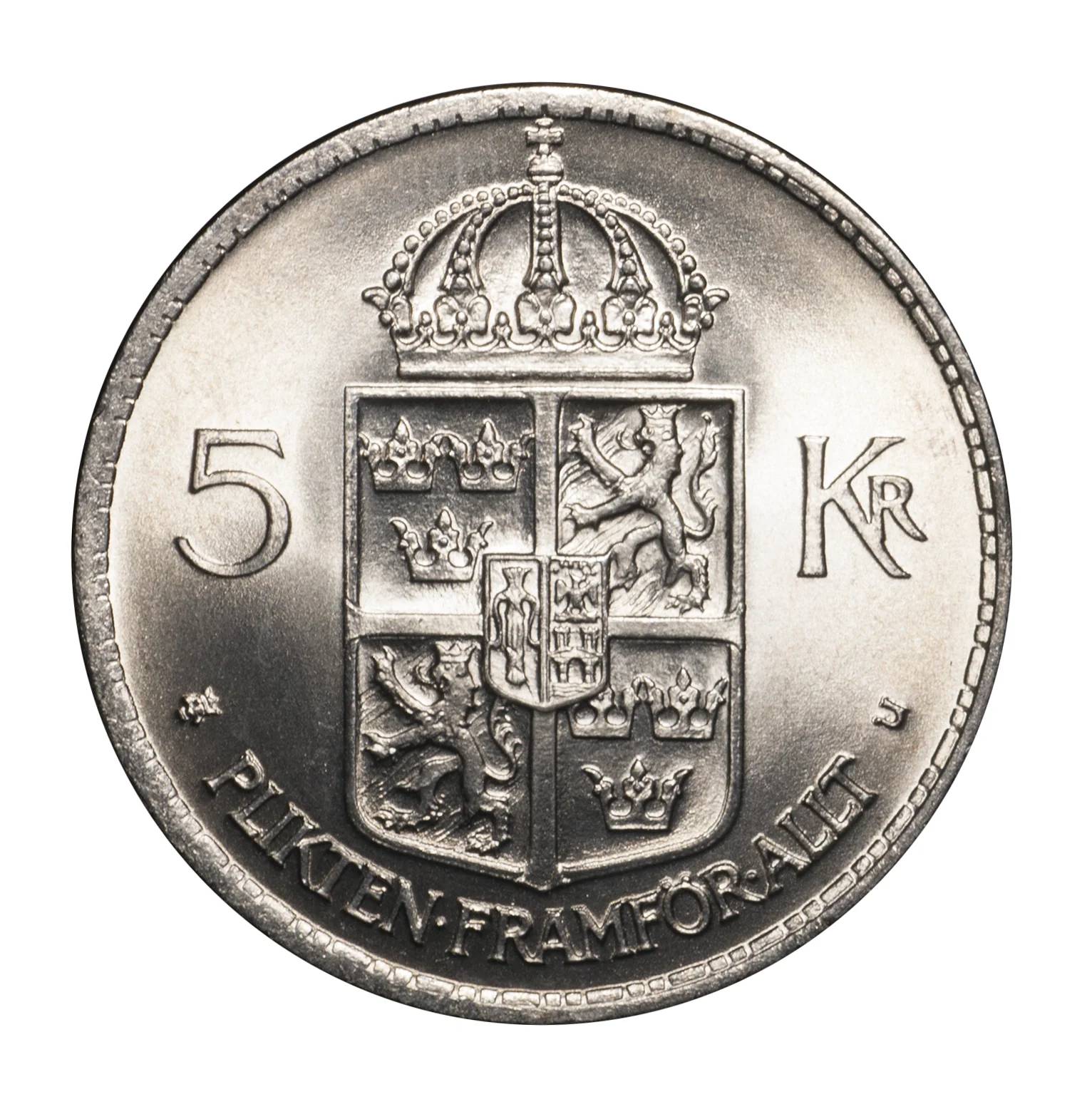 Sweden's coat of arms splits the value. Below, the King's motto is flanked by the mintmark and the Riksbank Governor's initial.
