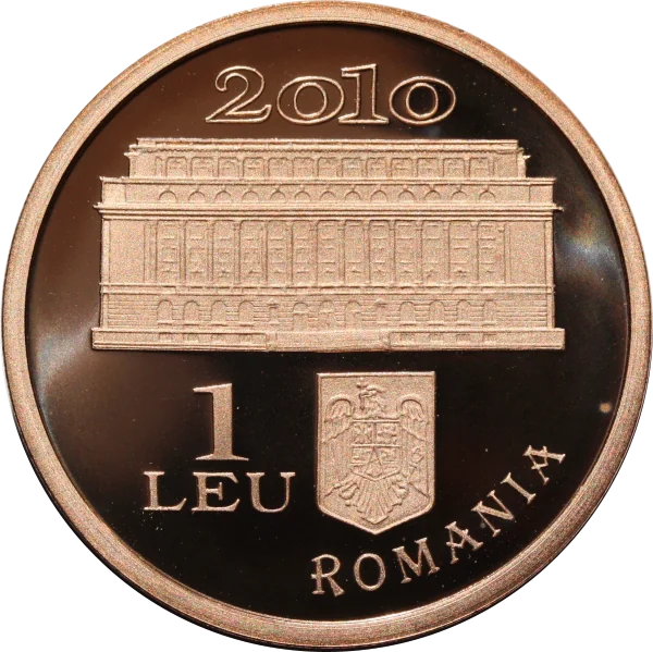 2010 issue, featuring the New Palace of the National Bank of Romania, the Romanian coat of arms, the face value "1 LEU", and the arched inscription "ROMANIA".