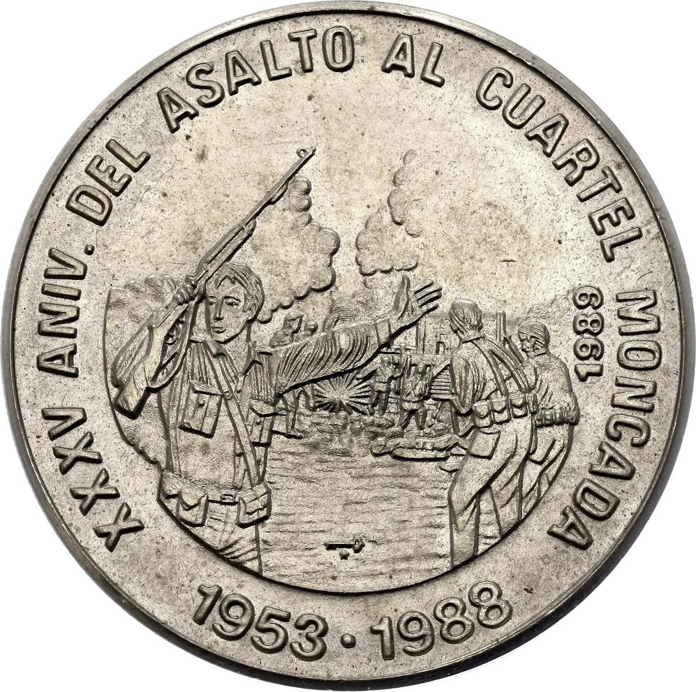 Assault on the Moncada Garrison scene. Curved legend above and sides, dates below, issue year right, mintmark under image.