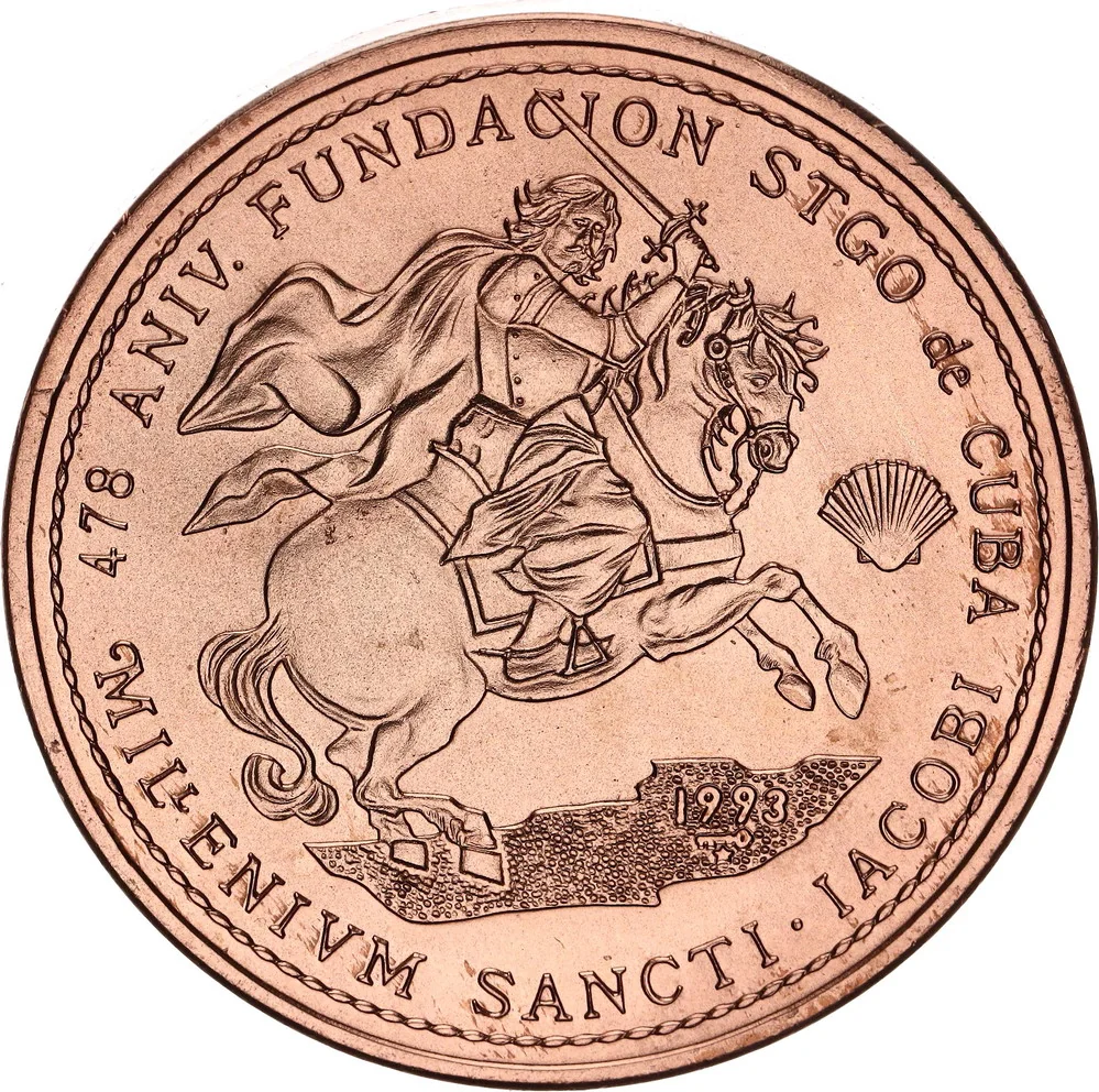 Description: Armored St. Jacobi on rearing horse right, shell beside. Commemorative text above and below near edge. "Millenium" misspelled. Date and mintmark lower right, dotted border.