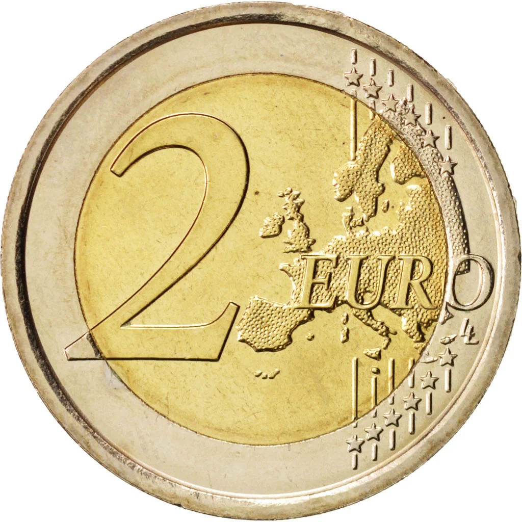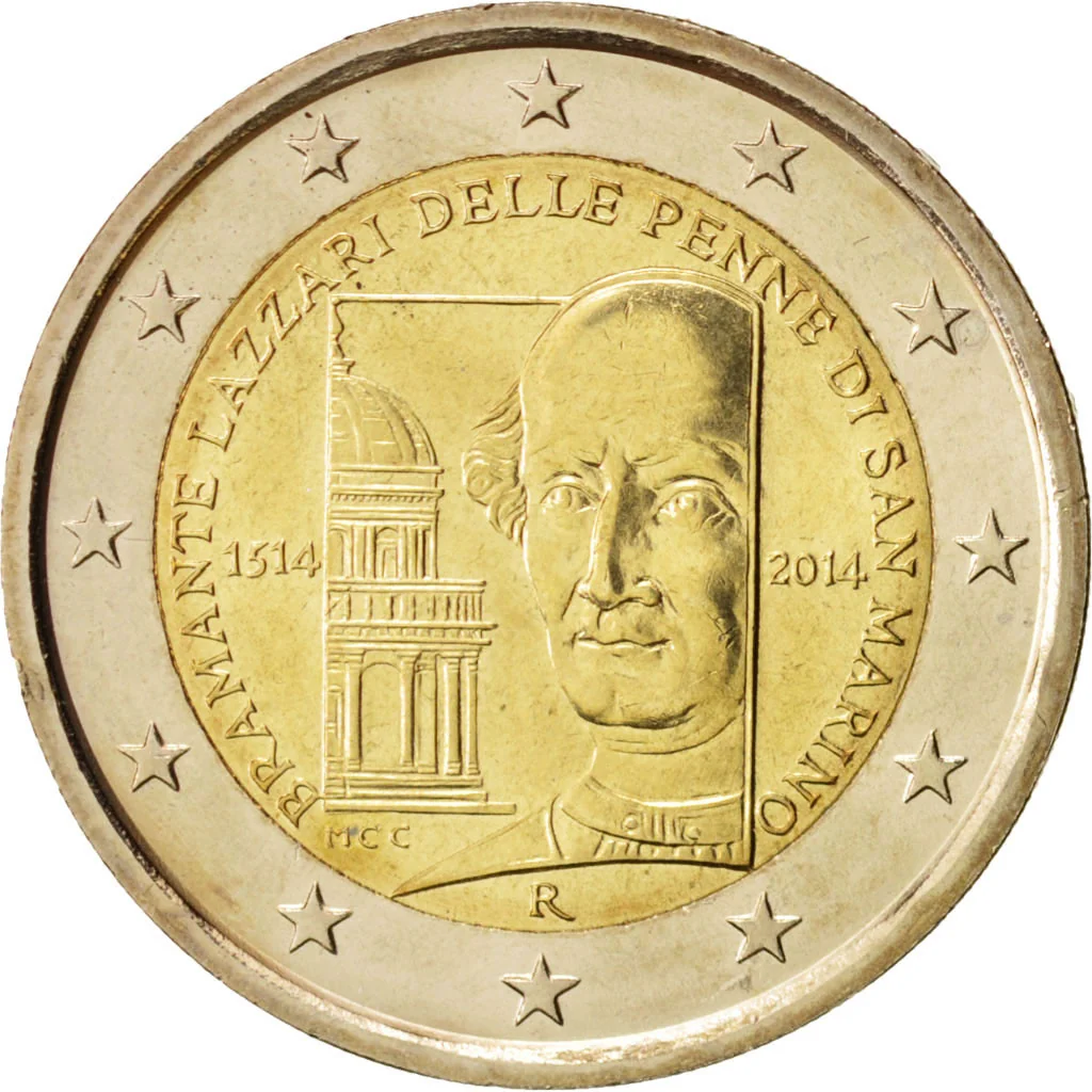 Description: The coin features Bramante’s portrait and part of his Tempietto, a 1502 tomb masterpiece in San Pietro in Montorio. The inscription ‘BRAMANTE LAZZARI DELLE PENNE DI SAN MARINO’ encircles the design, with the years ‘1514’ and ‘2014’ at the sides. At the bottom are the artist’s initials ‘MCC’ and the mint mark. The outer ring bears the 12 stars of the European Union.