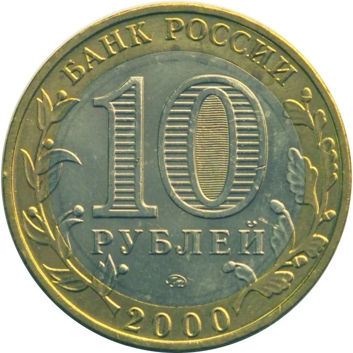 Center: The face value "10 РУБЛЕЙ". Inside the "0", hidden images of "10" and "РУБЛЕЙ" appear when tilted. Below: the mint mark. The ring reads "БАНК РОССИИ" above and "2000" below, with stylized plant branches extending onto the disc.