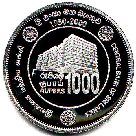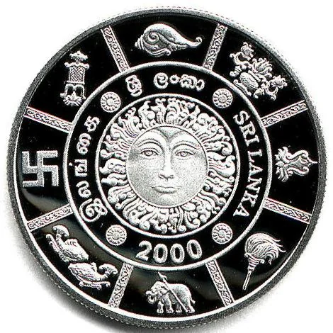 Description: A central sun encircled by the words "Sri Lanka" in Sinhala, Tamil, and English with the year 2000. Eight Astamangala symbols surround it: Sankha, Punkalasa, Srivatsa, Camara, Ankusa, Matsy-yugala, Nandyavarta, and Bhadrapitha.
