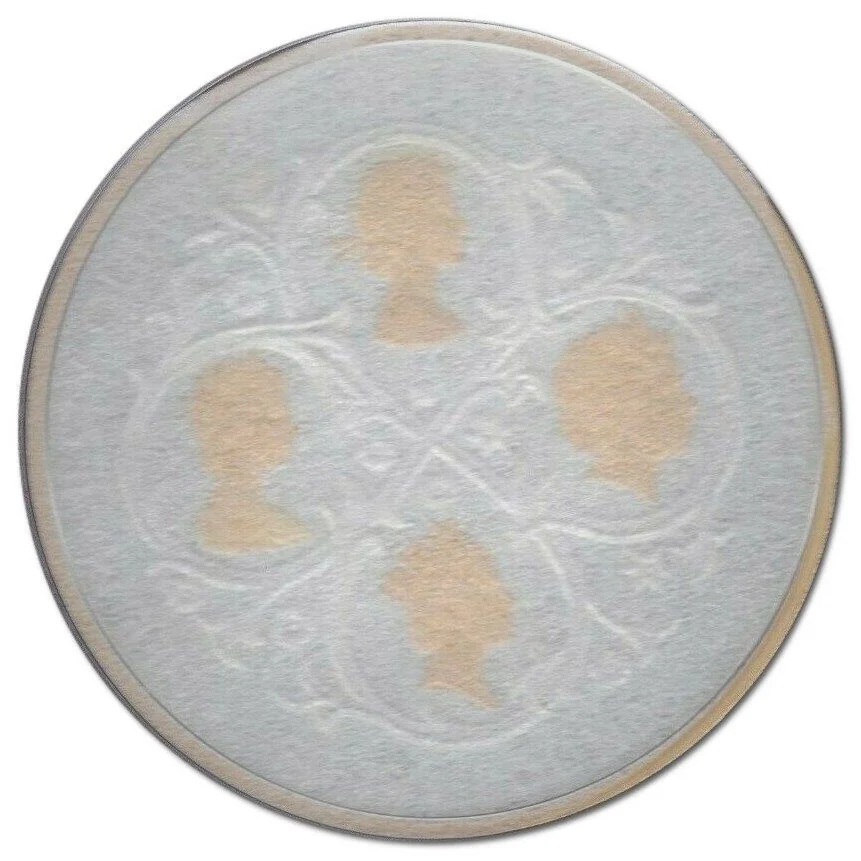 Four gilt coin portraits in an ornate quadrilobe frame: Elizabeth II and a cross of eight floral emblems.