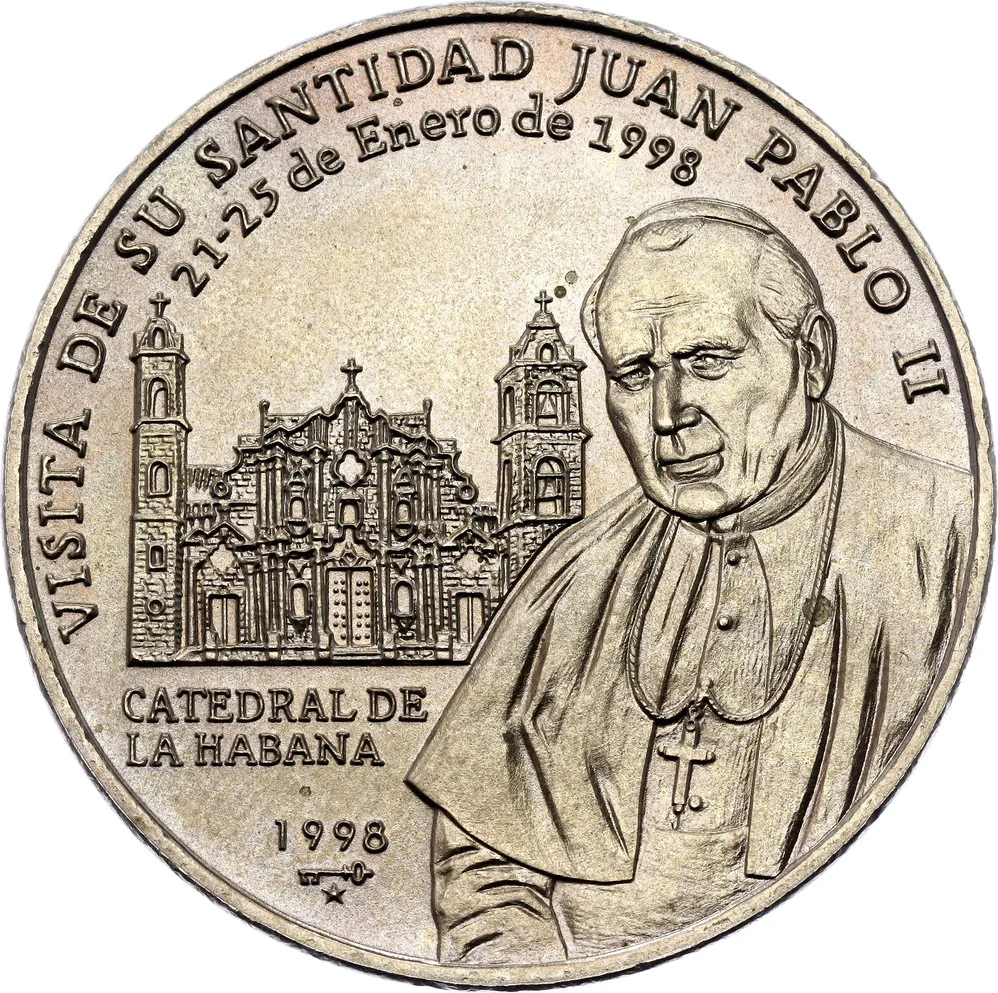 Half-length figure of Pope John Paul II facing left, with Havana Cathedral in the background. Event text surrounds, with issue date and mintmark at lower left.