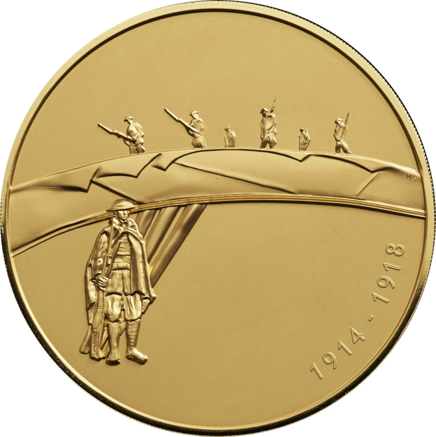 Soldiers march through trenches, a caped soldier with rifle and helmet in foreground. Dates at right.