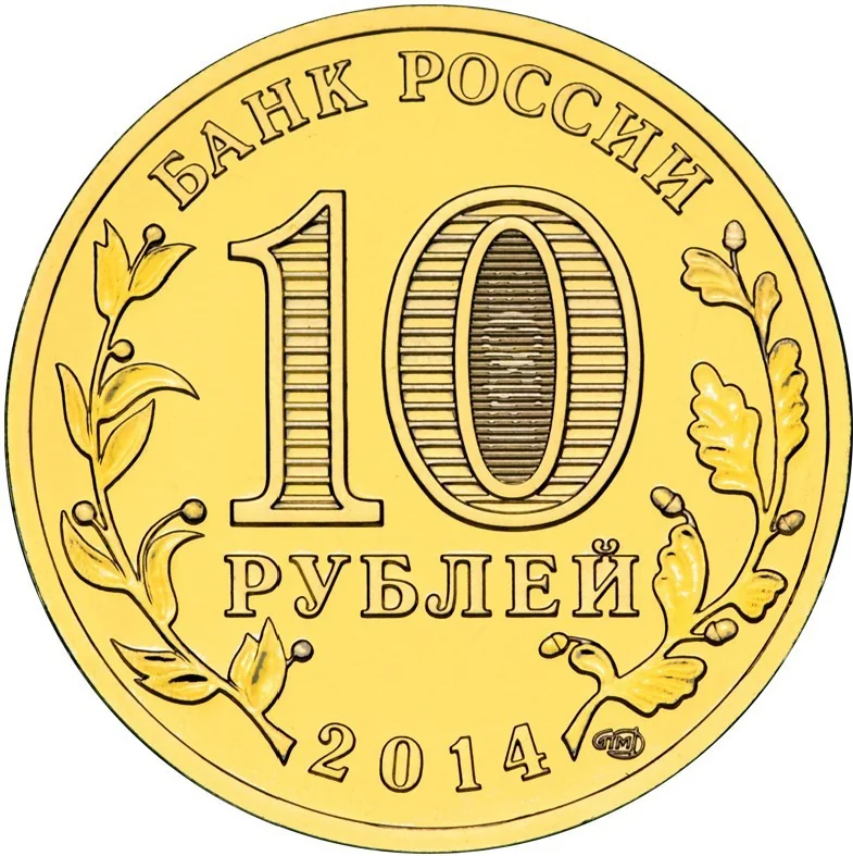 The upper rim bears "БАНК РОССИИ" (BANK OF RUSSIA), with the issue year "2014" below. Stylized laurel and oak branches flank the center, which features the face value "10 РУБЛЕЙ" (10 ROUBLES). Inside the "0" is a hidden "10" and "РУБ" (RUB) visible at different angles. The mint mark is at the bottom.