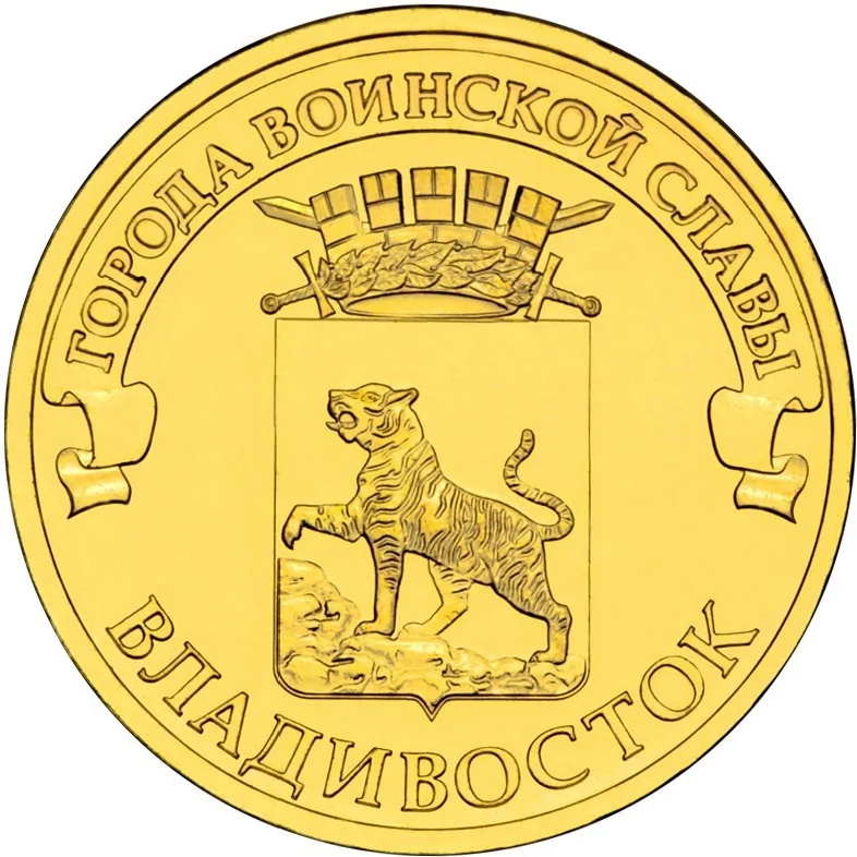 This side features the Vladivostok emblem, encircled by the inscriptions "ГОРОДА ВОИНСКОЙ СЛАВЫ" above and "ВЛАДИВОСТОК" below.