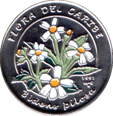 Romerillo (Bidens Pilosa) multicolor flowers. Curved series above, plant name below, mintmark and date at lower right.