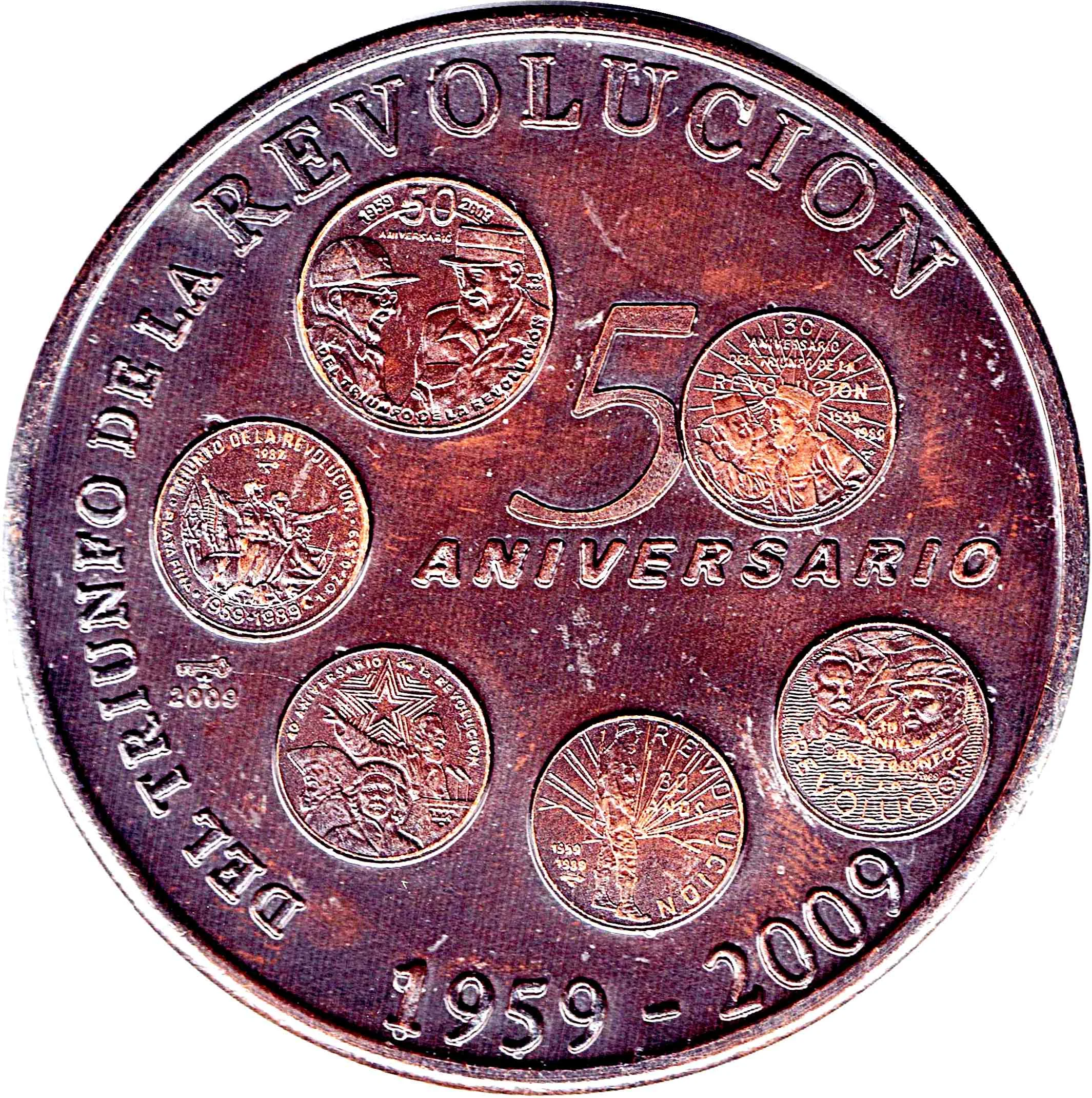 Description: Six Cuban anniversary coins (30th, 40th, 50th) with central images; one forms the zero in "50." Inscription encircles. Date at left.