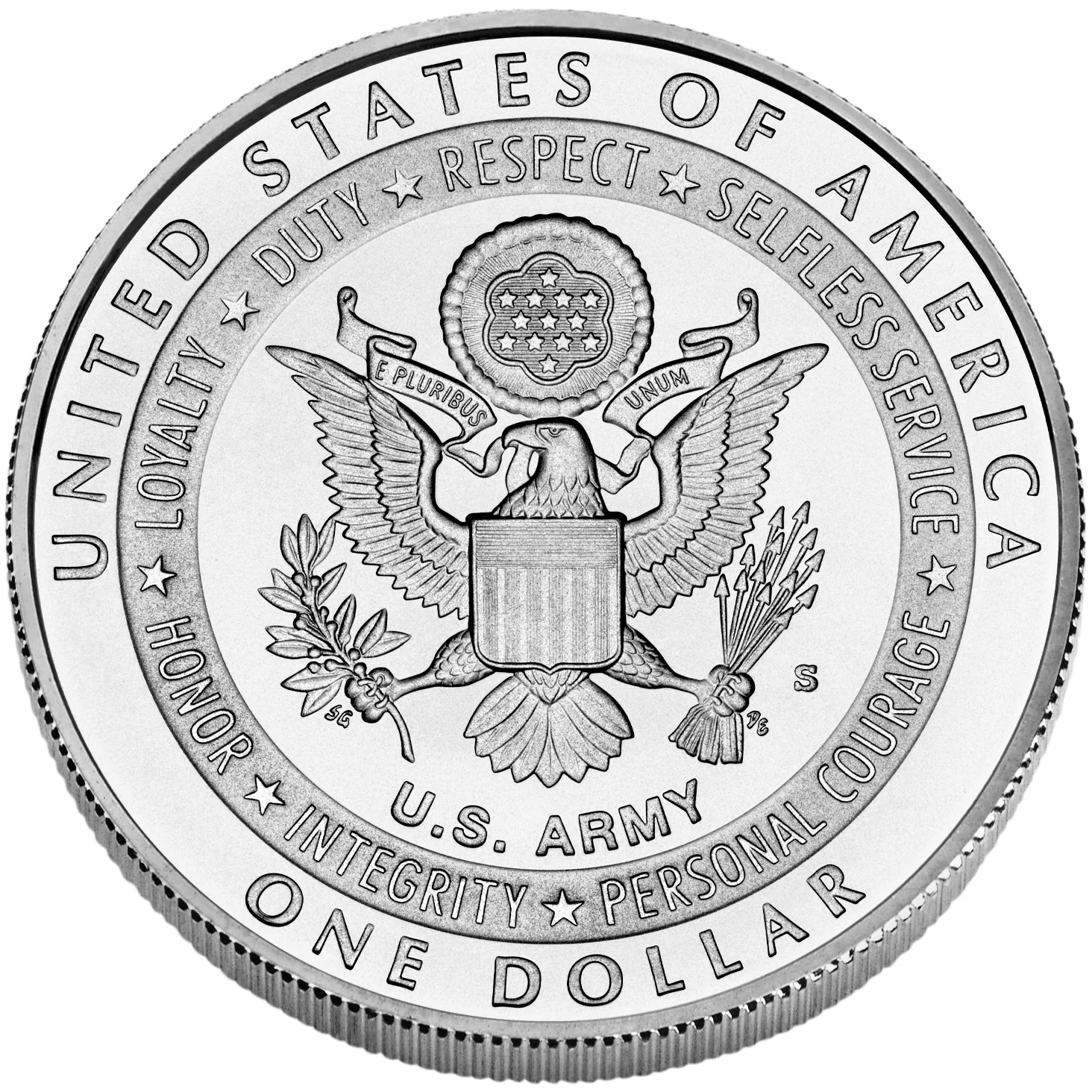 The Army uniform's Great Seal, encircled by stars and the seven Army values.