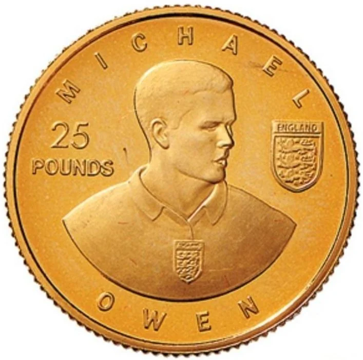 Soccer bust with name above, surname below, team emblem right, denomination left.