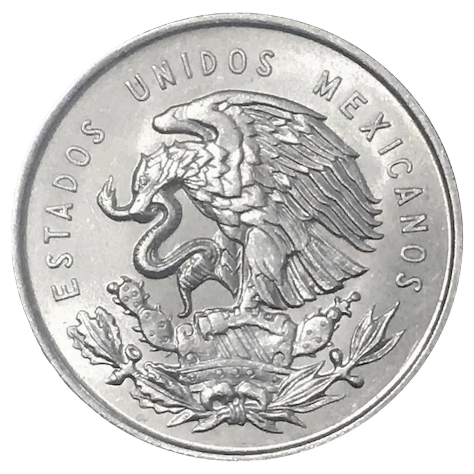 King Cuauhtemoc faces right toward a descending eagle, with date, denomination, and mint mark.