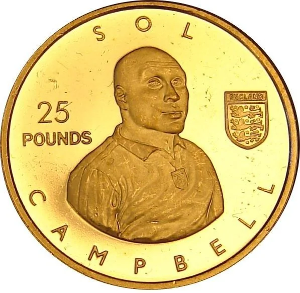 Soccer bust with name above, surname below, team emblem right, denomination left.