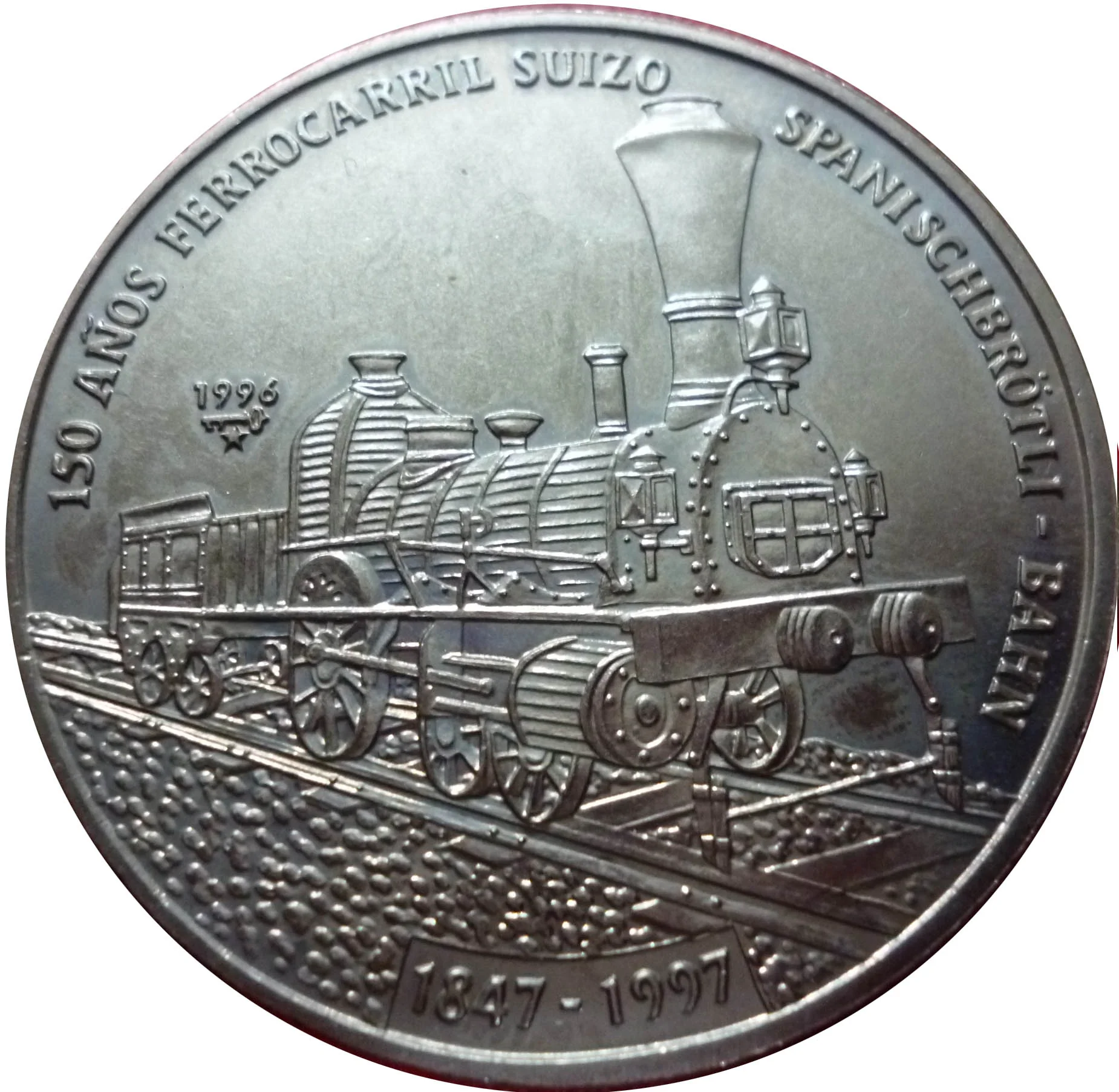First Swiss train, right. Curved legend above and on sides. Issue date and mintmark left center; years below.