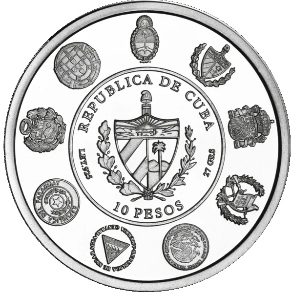 Description: National arms encircled by the arms of the nine issuing nations (Argentina, Cuba, Spain, Guatemala, Mexico, Nicaragua, Paraguay, Peru, Portugal). Circle includes country name above, purity and weight on sides, face value below.