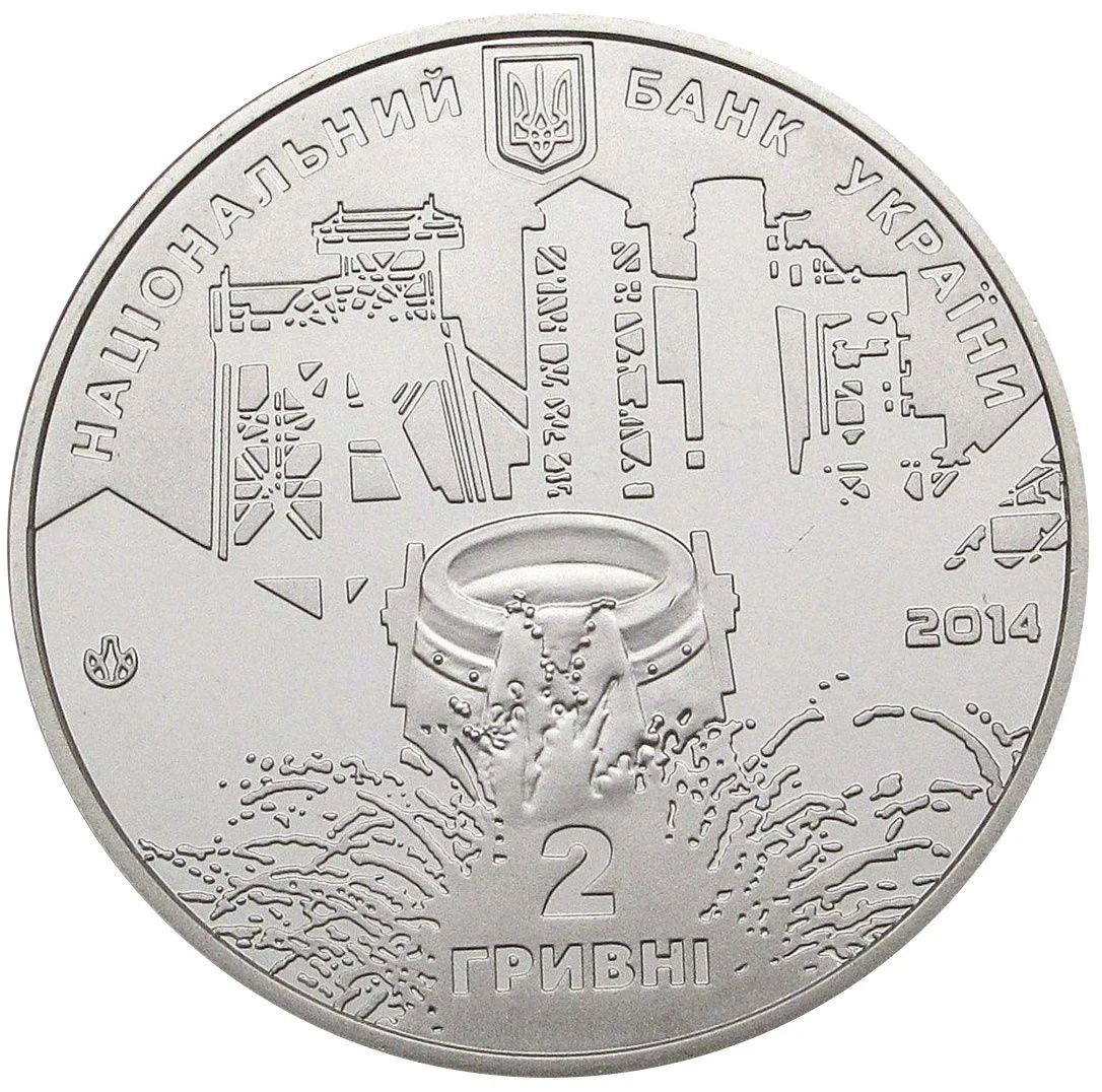 The obverse features Ukraine's Small Coat of Arms with the inscription "National Bank of Ukraine." The central design represents labor, flanked by the year 2014 and the Mint mark. Below is the face value: 2 hryvnias.