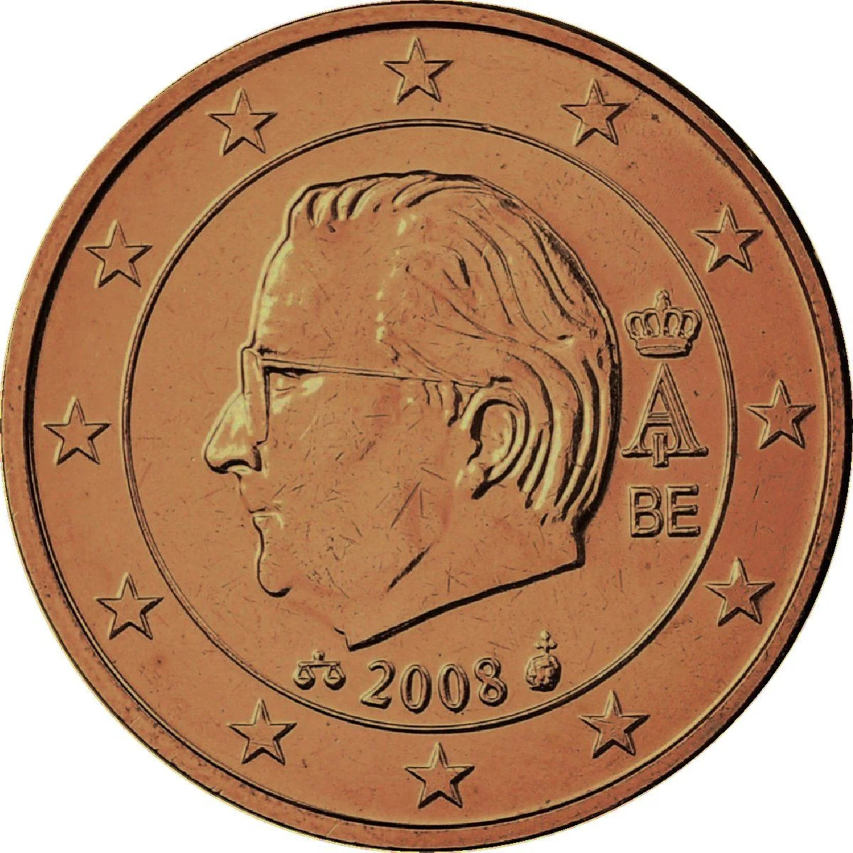 King Albert II's left profile (adapted from the 1999-2007 coin design) is encircled by the twelve EU stars, with the letters "BE" and his crowned "AII" monogram placed between them. This updated national side follows new European Central Bank guidelines.