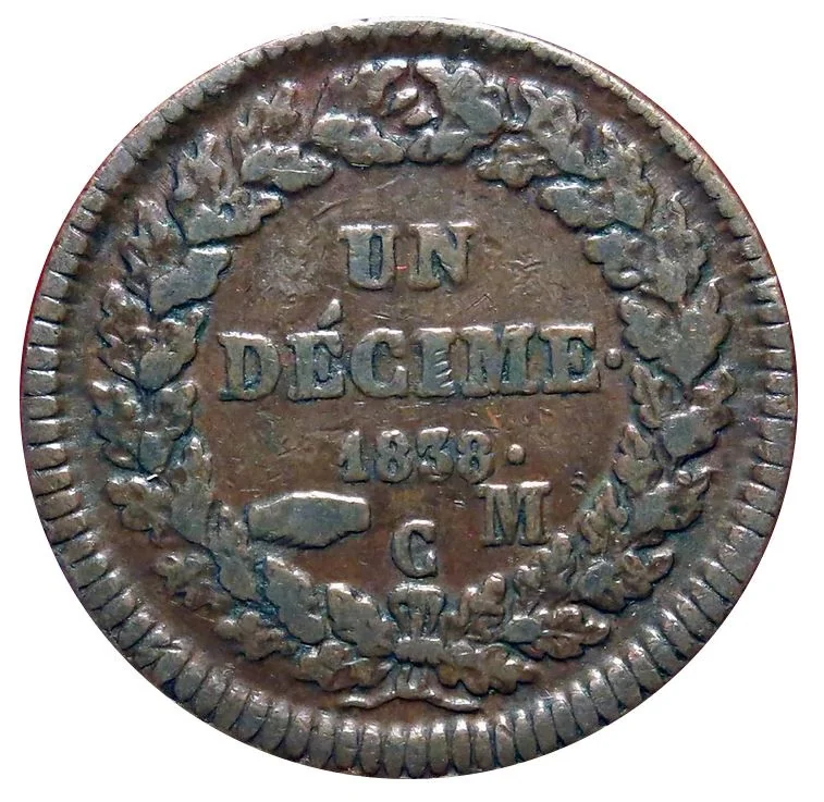 1838 DECIME. Clasped hands (good faith) M C within an oak wreath tied with ribbon.