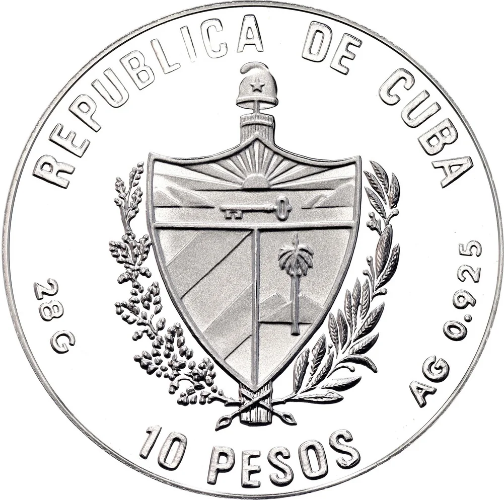 Cuban coat of arms with curved country name above, face value below, and weight and fineness on the sides.