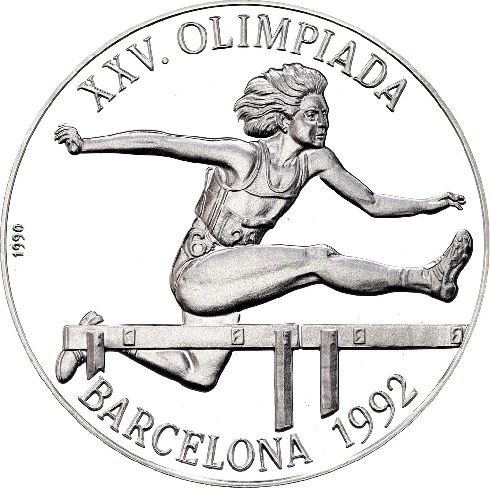 Hurdler jumping right; event name in curved text above and below; issue year rotated 90° on left.