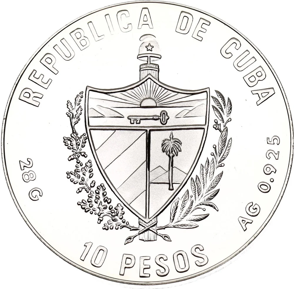 Cuban coat of arms with curved country name above, face value below, and weight and fineness on the sides.