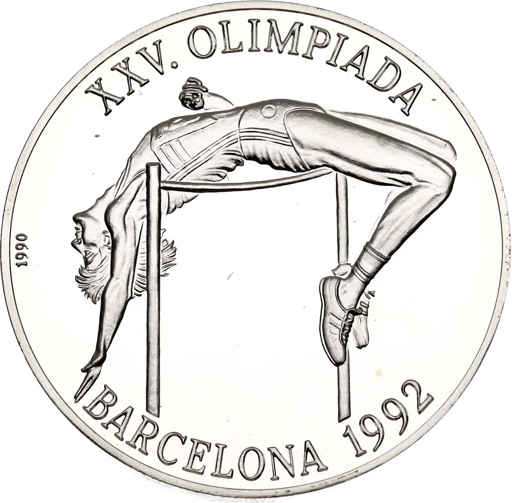 Woman high jumper left, curved text above and below, issue year left.